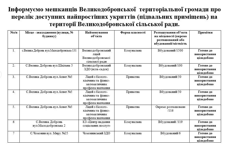 Перелік доступних найпростіших укриттів (підвальних приміщень) на території Великодобронської сільської ради.