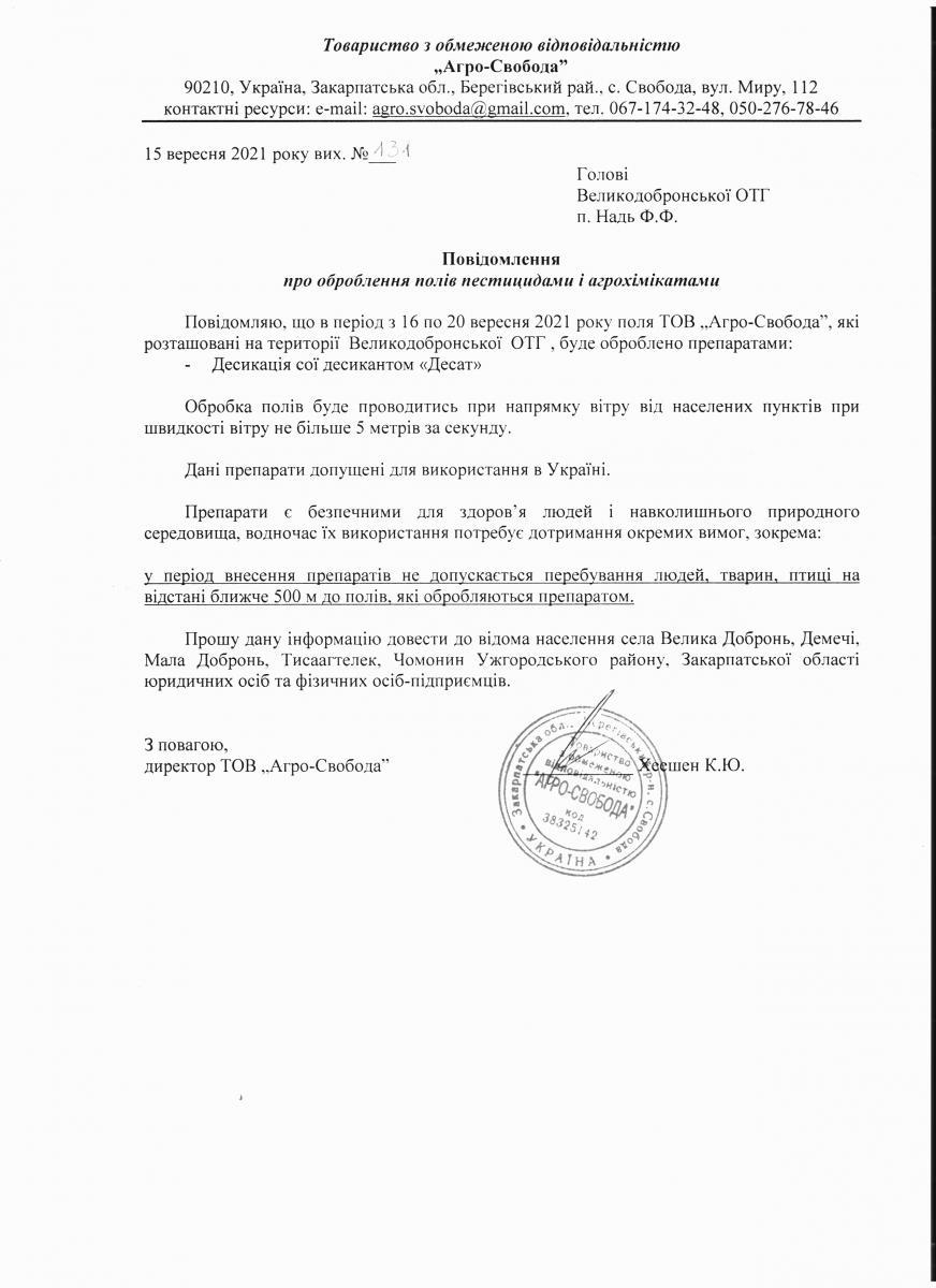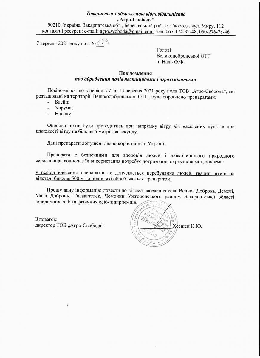 • Вих. лист №123 від 07.09.2021 року