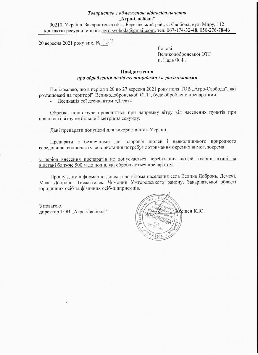 • Вих. лист №137 від 20.09.2021 року