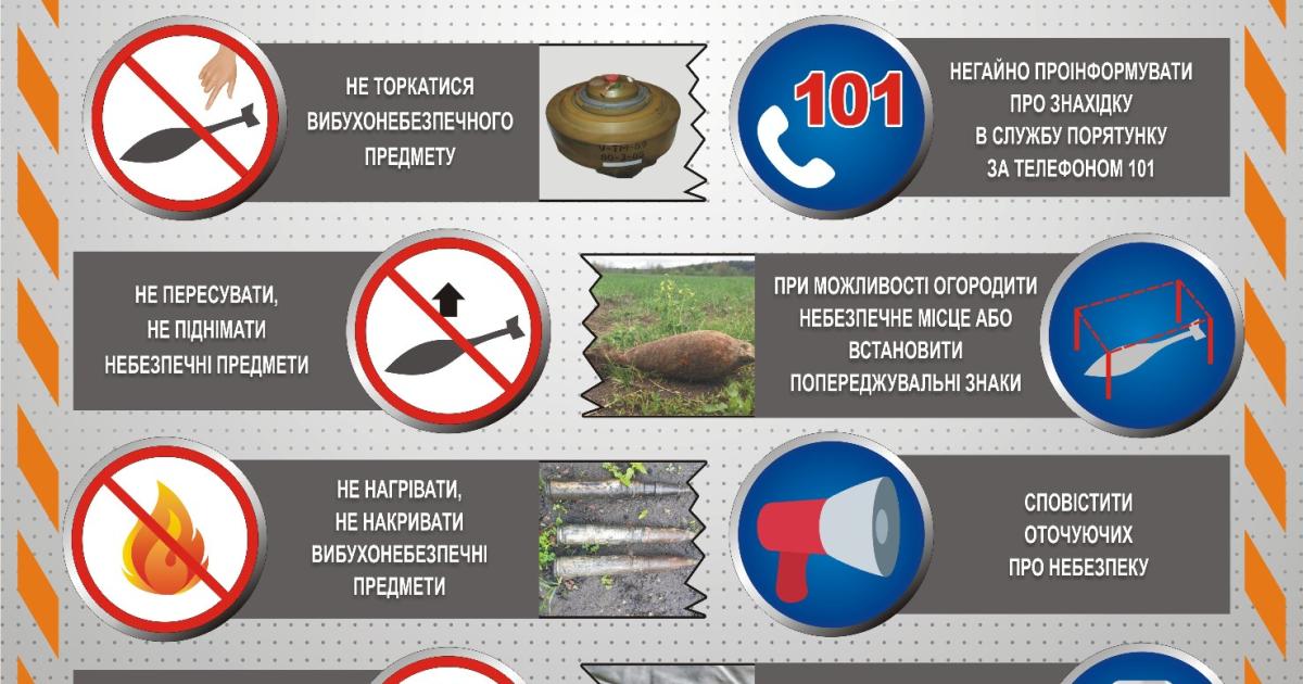 - терміново повідомте про знахідку в поліцію 102 або до ДСНС за тел. 101;