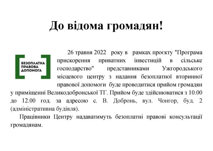 26 травня 2022 року в рамках проєкту "Програма прискорення приватних інвестицій в сільське господарство" представниками Ужгородського місцевого центру з надання безоплатної вторинної правової допомоги буде проводитися прийом громадян у приміщенні Великодобронської ТГ. Прийом буде здійснюватися з 10.00 до 12.00 год. за адресою с. В. Добронь, вул. Чонгор, буд. 2 (адміністративна будівля).